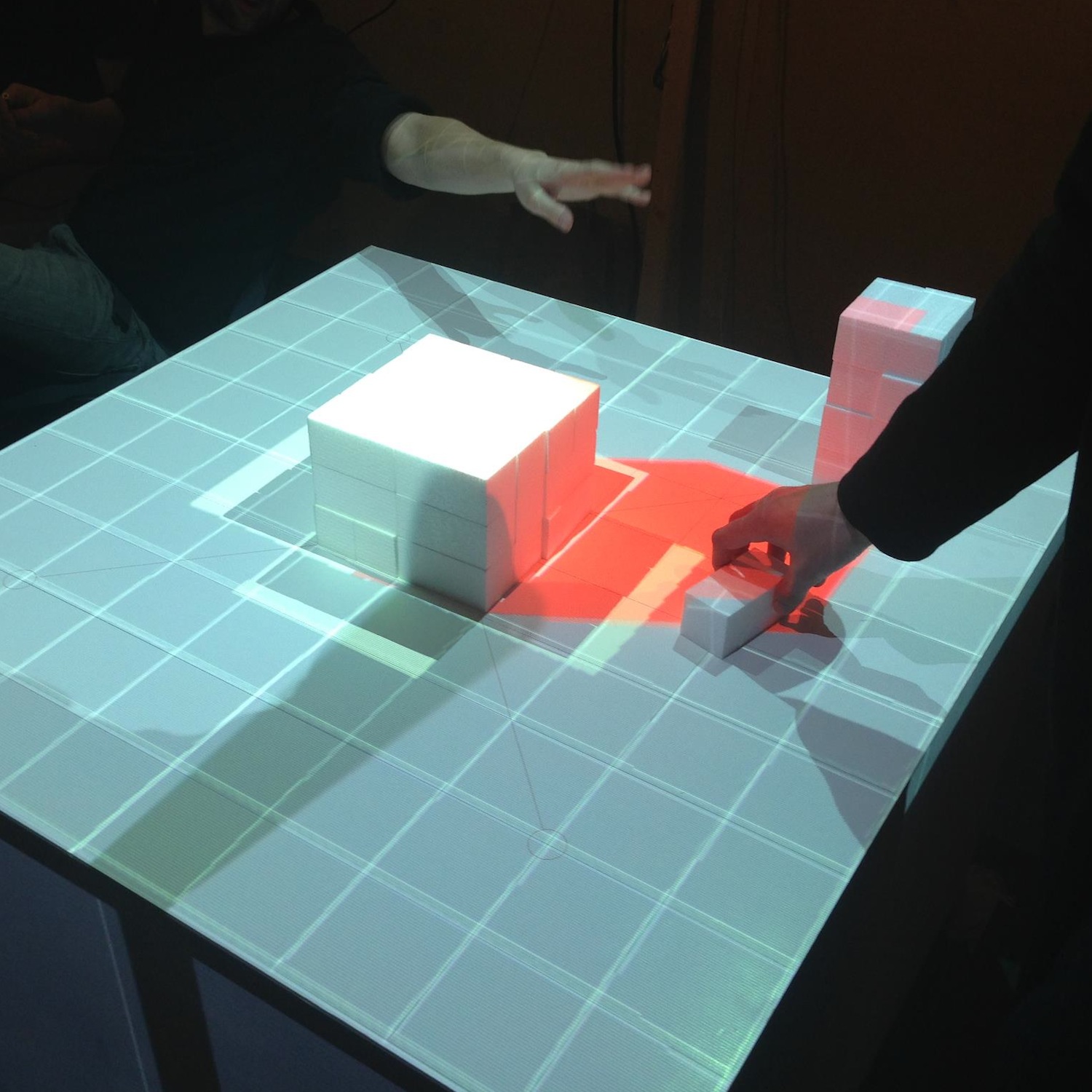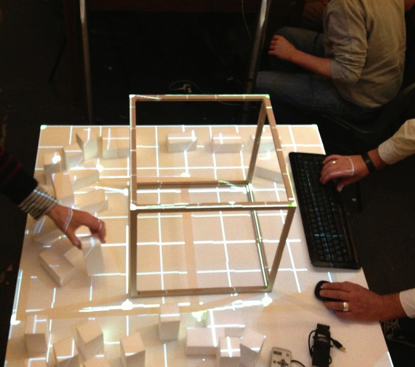 The goal of the workshop at smartgeometry'13 was to create a working prototype of a physical urban model that is augmented with real-time analysis. We worked with the cluster participants to formulate a design concept of the prototype and to break down the challenge into individual modules, e.g. analysing and cleaning the geometry, algorithms for real time analysis, projecting imagery onto the physical model.
